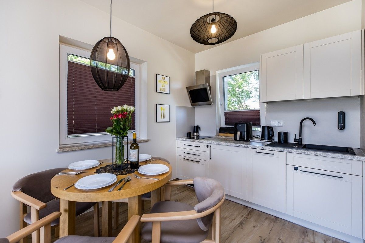 - Kuchnia połączona z salonem, w pełni wyposażona (zmywarka, kieliszki do wina, płyta kuchenna, czajnik elektryczny, naczynia, sztućce)