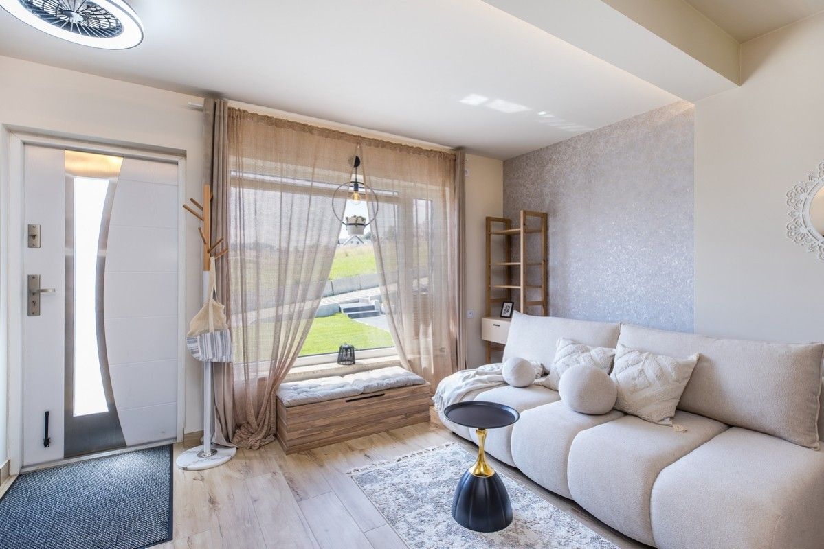 - Przestronny salon z rozkładaną, dwuosobową sofą, telewizorem i strefą relaksu