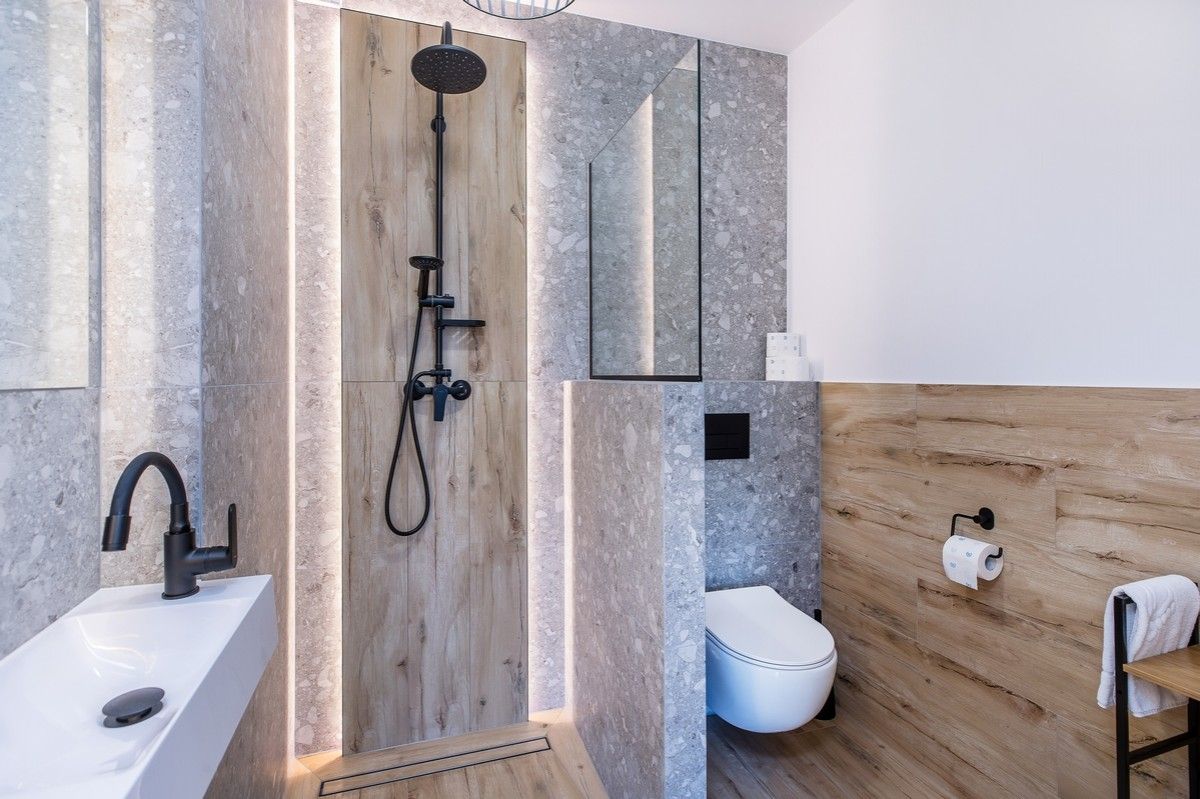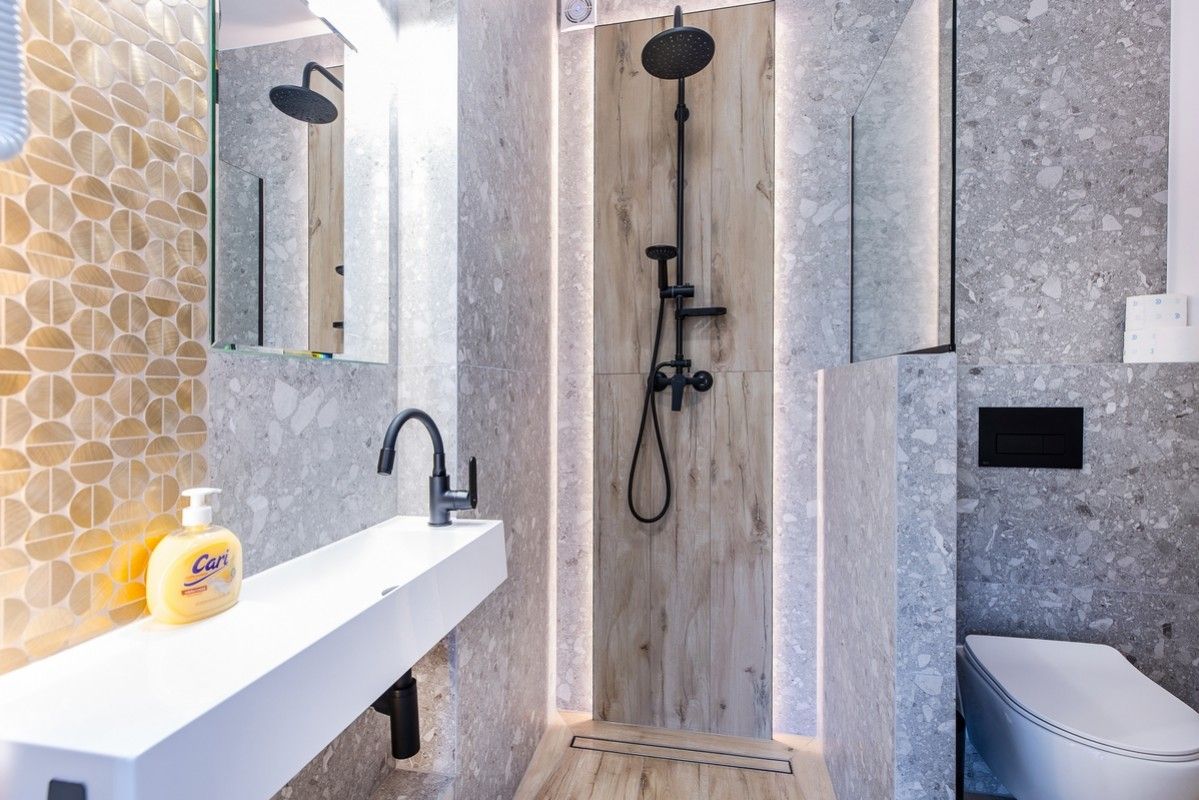 - Nowoczesna łazienka z prysznicem, suszarką do włosów