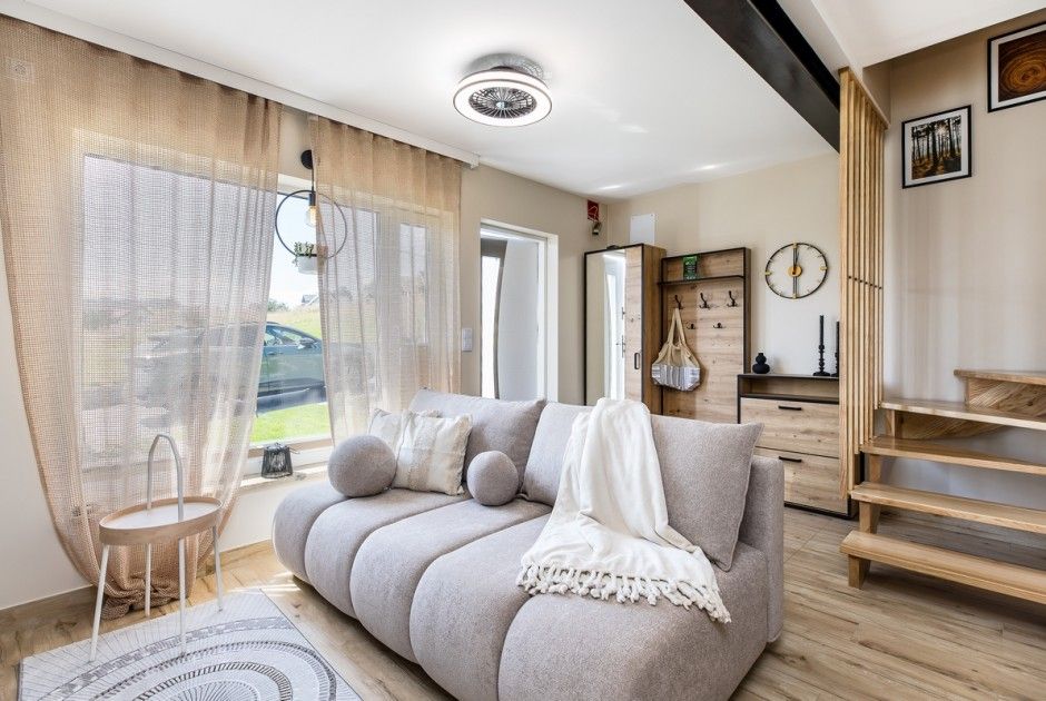 - Przestronny salon z rozkładaną, dwuosobową sofą, telewizorem i strefą relaksu