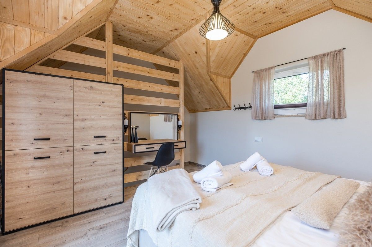 Wnętrze domku zaprojektowane zostało z dbałością o wygodę i funkcjonalność: