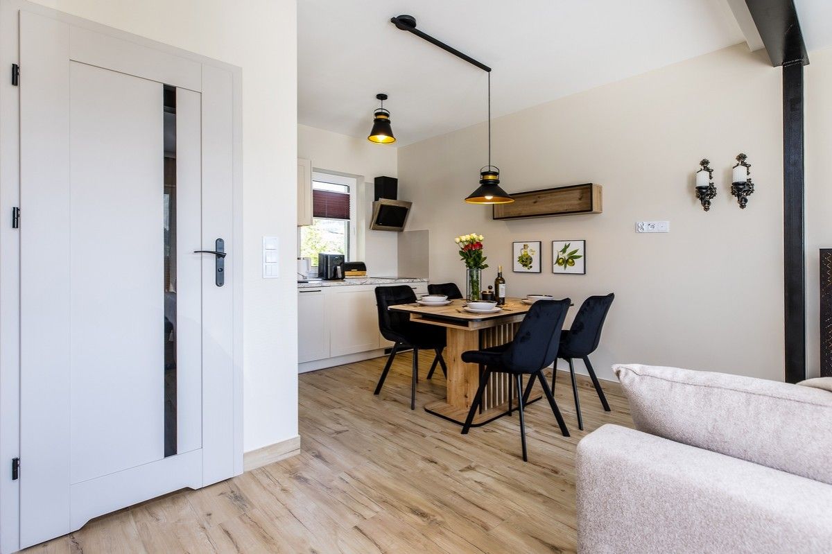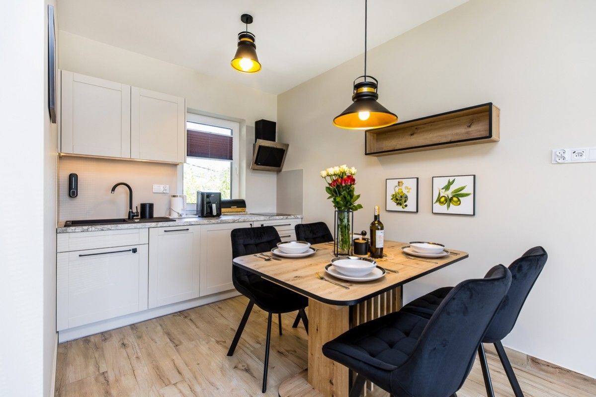 - Kuchnia połączona z salonem, w pełni wyposażona (zmywarka, kieliszki do wina, płyta kuchenna, czajnik elektryczny, naczynia, sztućce)