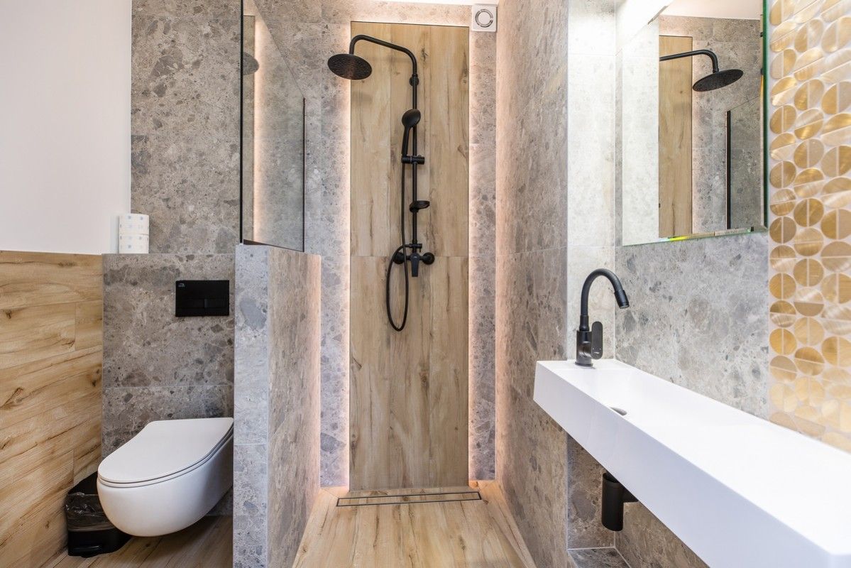 - Nowoczesna łazienka z prysznicem, suszarką do włosów