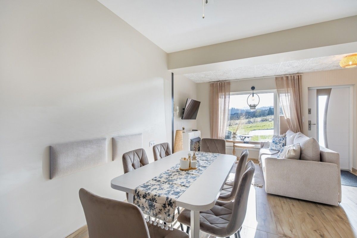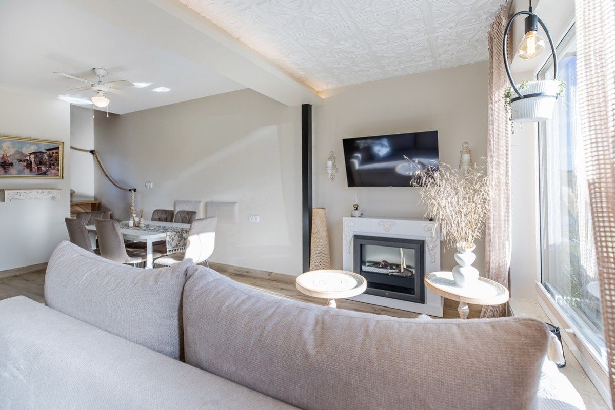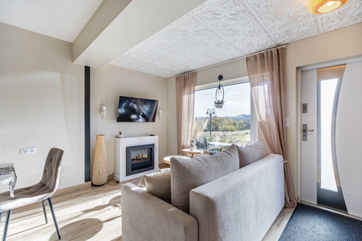 - Przestronny salon z rozkładaną, dwuosobową sofą, telewizorem i strefą relaksu