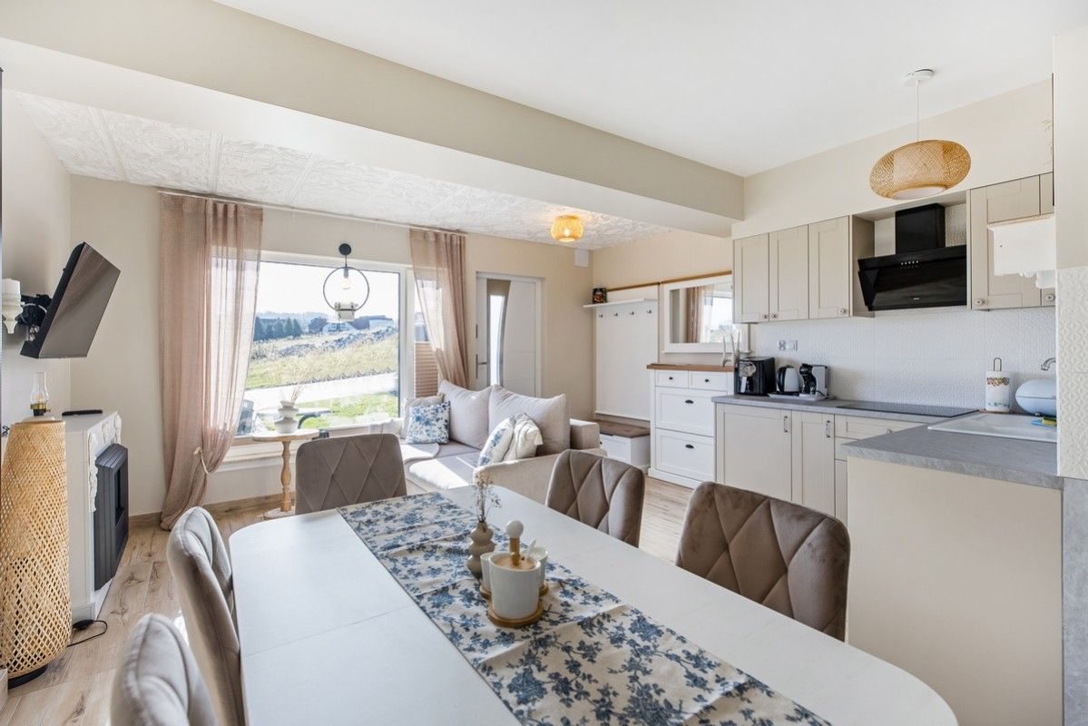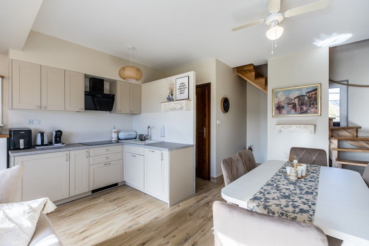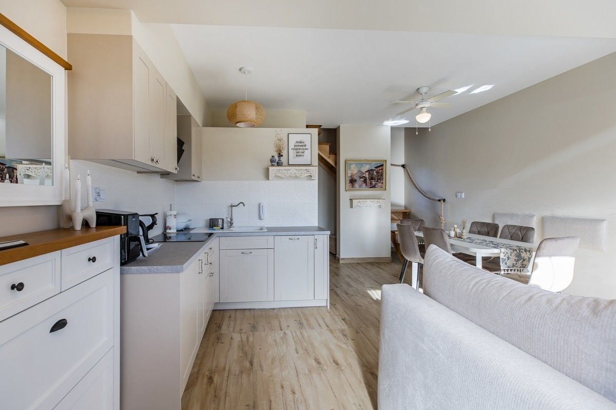- Kuchnia połączona z salonem, w pełni wyposażona (zmywarka, kieliszki do wina, płyta kuchenna, czajnik elektryczny, naczynia, sztućce)