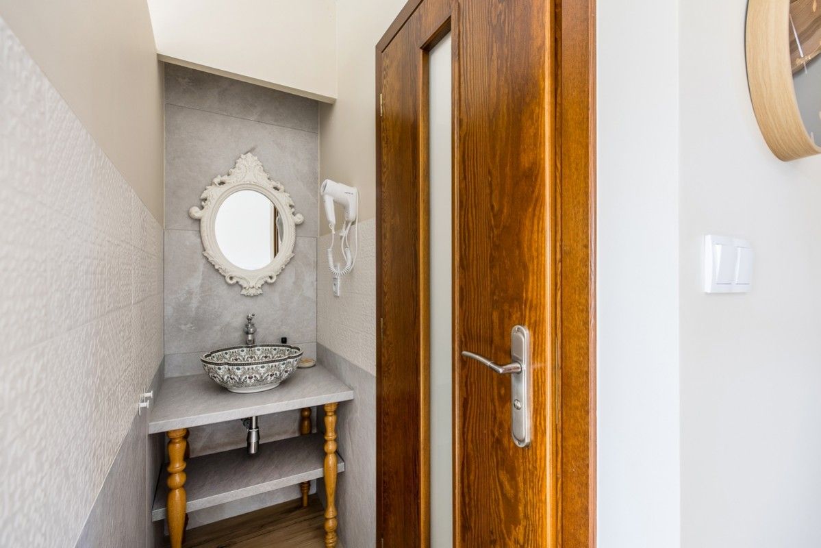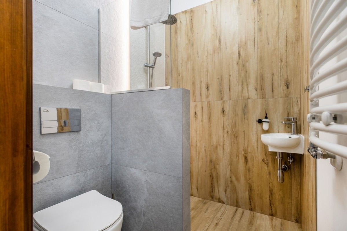 - Nowoczesna łazienka z prysznicem, suszarką do włosów