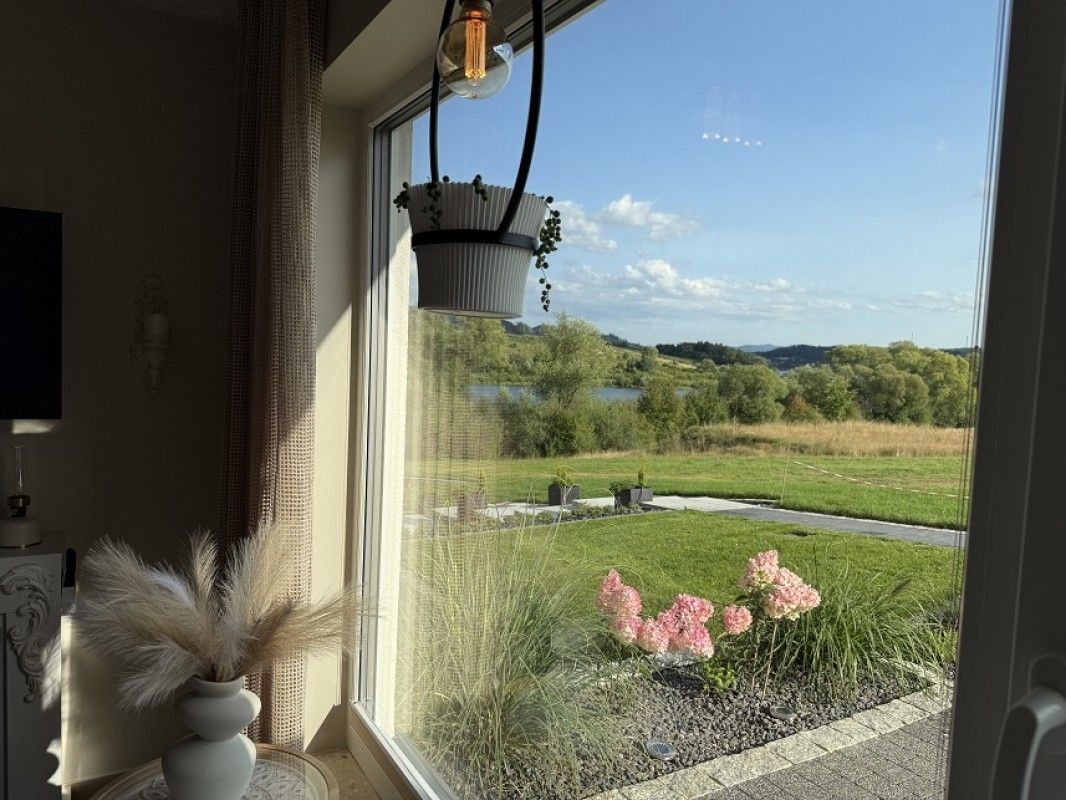 - wyjście na taras z widokiem na jezioro i góry