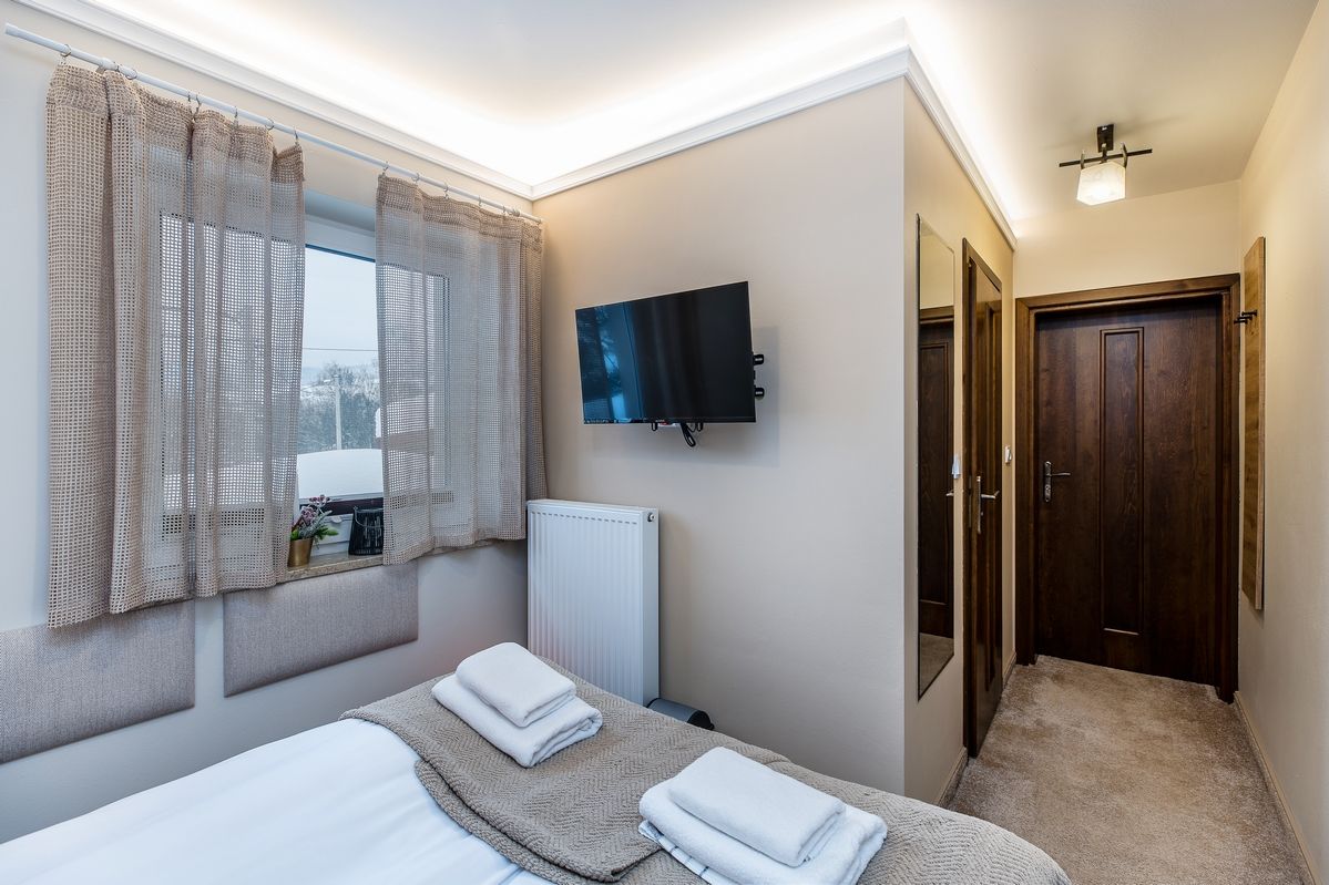 Pokój nr 3P to elegancki, nowoczesny pokój wypoczynkowy przeznaczony dla maksymalnie 2 osób zlokalizowany w kompleksie Czarna Perła w Kluszkowcach, tuż nad Jeziorem Czorsztyńskim. Przestronne wnętrze, wysokiej klasy wyposażenie oraz piękne widoki sprawiają, że to idealna przestrzeń na wypoczynek z rodziną lub przyjaciółmi – o każdej porze roku.